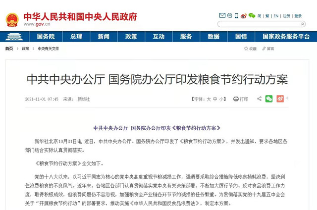 近日,中共中央辦公廳、國(guó)務(wù)院辦公廳印發(fā)了《糧食節(jié)約行動(dòng)方案》。(圖片來(lái)源:中華人民共和國(guó)中央人民政府網(wǎng)站)