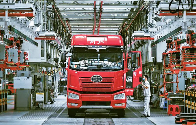 企業(yè)強則國家強,加快建設(shè)世界一流企業(yè)是全面建設(shè)社會主義現(xiàn)代化國家的重大任務(wù),是新時代國有企業(yè)的戰(zhàn)略目標(biāo)。近來,一汽解放集團股份有限公司生產(chǎn)按下“加速鍵”。圖為2022年6月15日,工人在位于吉林長春的一汽解放總裝車間內(nèi)裝配車輛。 新華社記者 許暢/攝