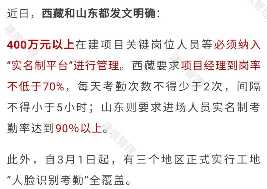 (一)在工程建設(shè)過程中,項(xiàng)目經(jīng)理在崗履職時(shí)間不應(yīng)少于本月施工時(shí)間的70%,總監(jiān)理工程師在崗履職時(shí)間不應(yīng)少于本月施工時(shí)間的40%(當(dāng)月施工時(shí)間如無放假、請假及其他特殊原因的按照當(dāng)月日歷天數(shù)計(jì)算),建設(shè)單位關(guān)鍵崗位人員到崗率不應(yīng)低于30%,整個(gè)項(xiàng)目關(guān)鍵崗位人員綜合到崗率不應(yīng)低于60%。對于項(xiàng)目關(guān)鍵崗位人員到崗率不滿足要求的,“實(shí)名制平臺”將自動(dòng)生成預(yù)警,各級住房和城鄉(xiāng)建設(shè)主管部門應(yīng)對相關(guān)項(xiàng)目列入“重點(diǎn)監(jiān)管對象”。建設(shè)單位、施工企業(yè)、監(jiān)理企業(yè)及其人員在人臉識別考勤中弄虛作假、偽造的,一經(jīng)發(fā)現(xiàn),按未到崗履職處理。