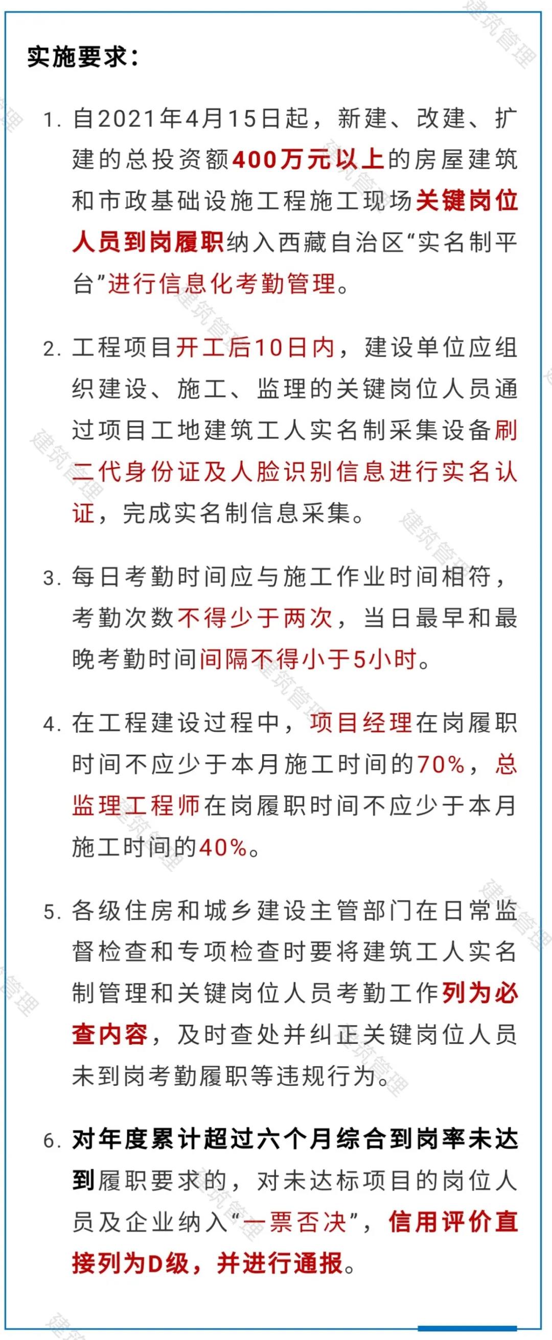 自2021年4月15日起,凡在我區(qū)行政區(qū)劃內(nèi)新建、改建、擴(kuò)建的總投資額400萬元以上的房屋建筑和市政基礎(chǔ)設(shè)施工程施工現(xiàn)場關(guān)鍵崗位人員到崗履職納入“西藏自治區(qū)建筑工人實(shí)名制管理平臺”(以下簡稱“實(shí)名制平臺”)進(jìn)行信息化考勤管理。